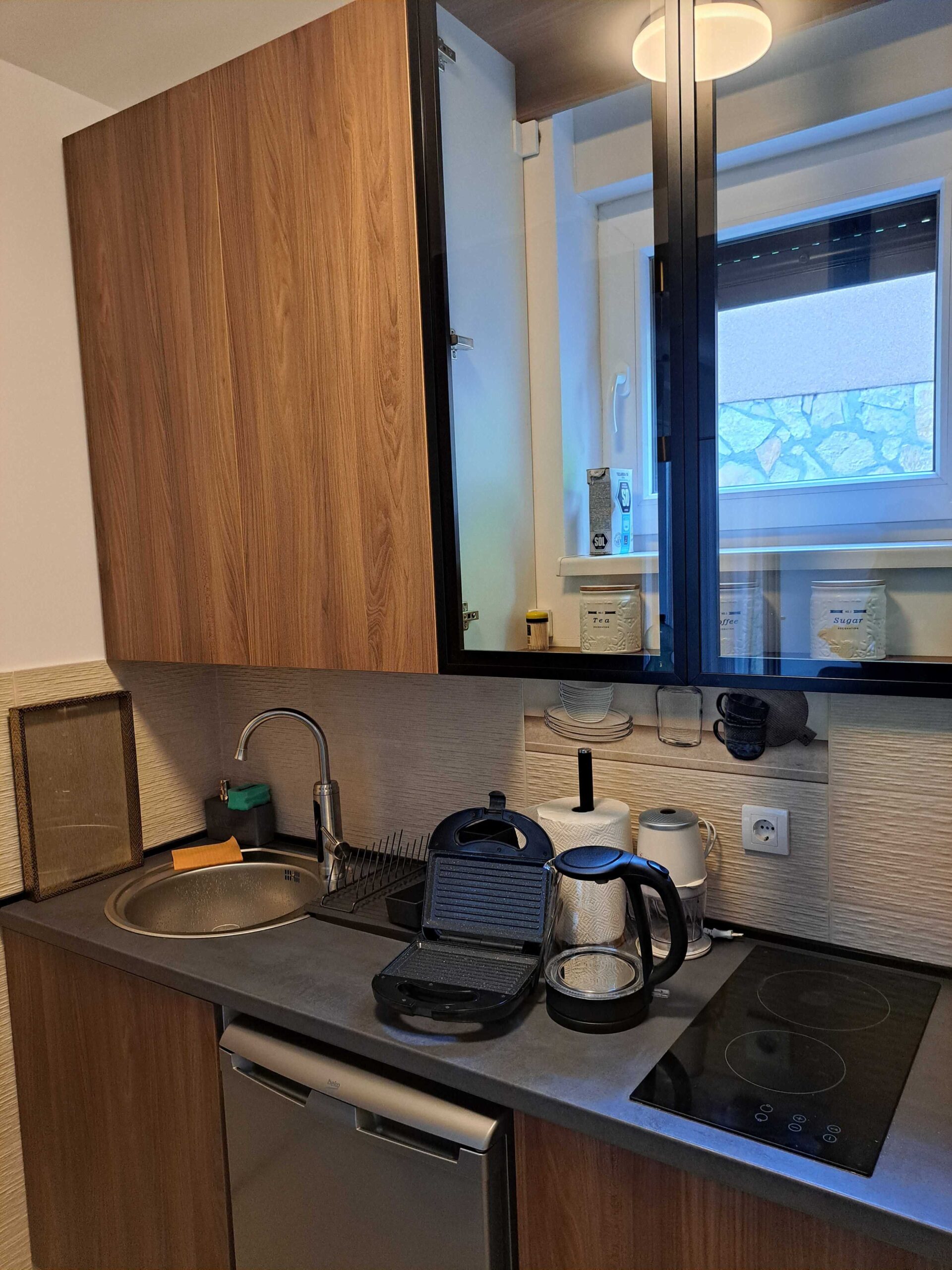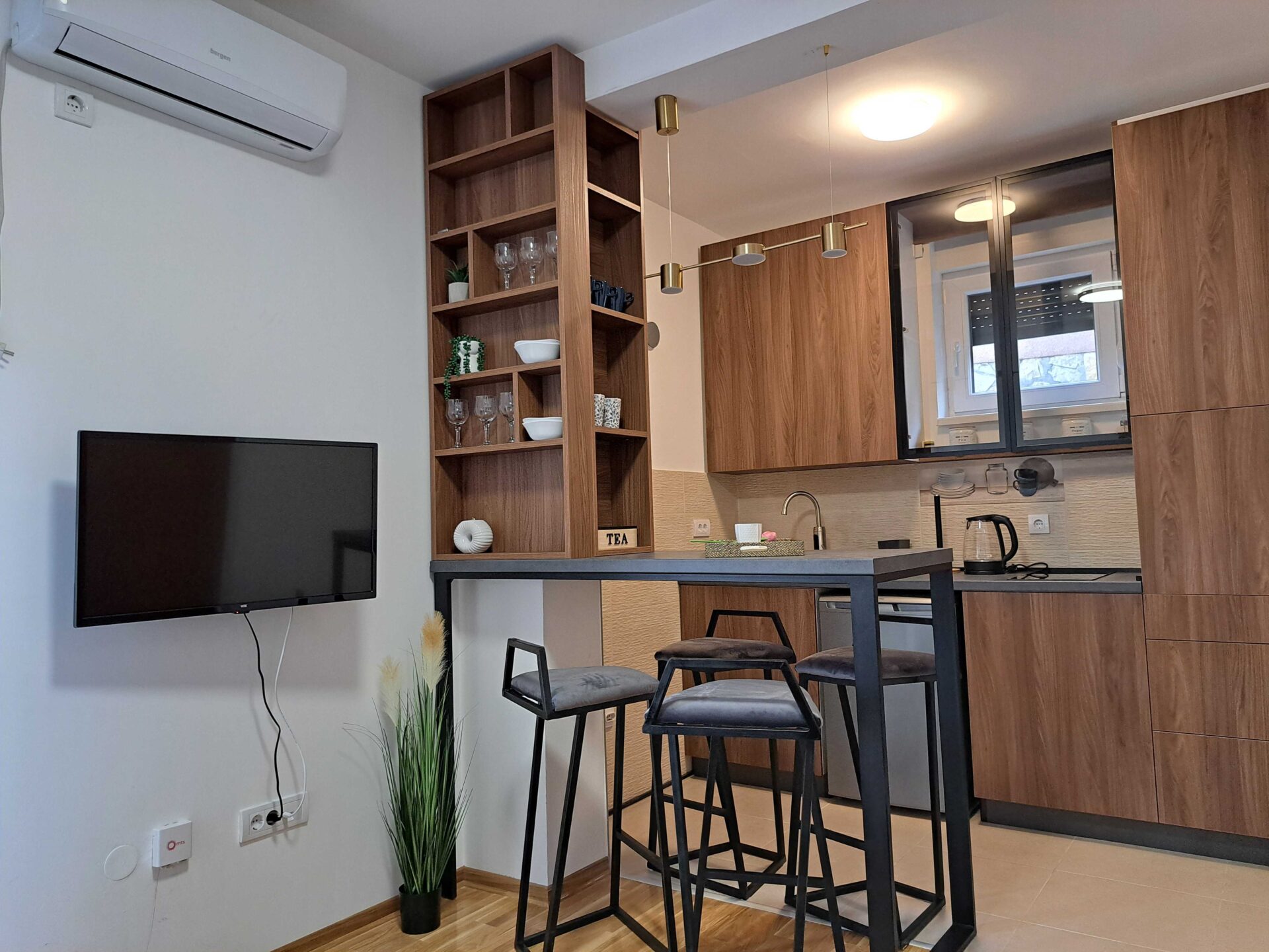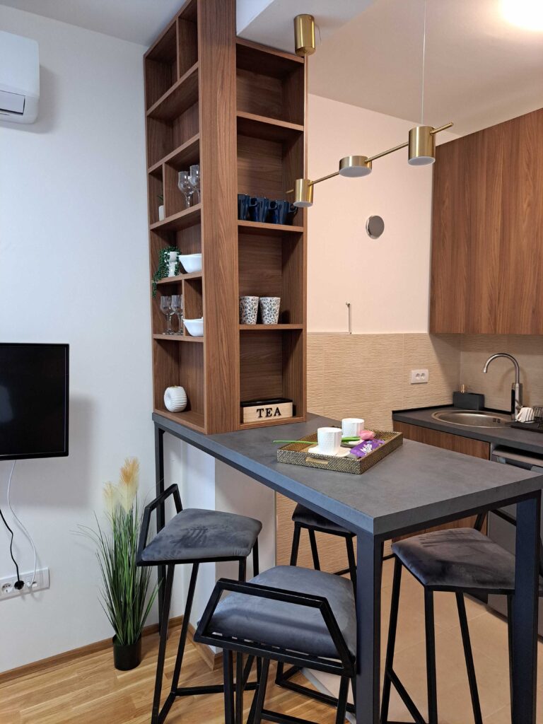 Kuhinja se sastoji iz sudopere, kuhinjskih elementa, indukcione ploče, frižidera, kuhinjskih aparata i posudja. Umesto klasičnog trpezariskog stola, gosti mogu koristiti šank sa barskim stolicama.