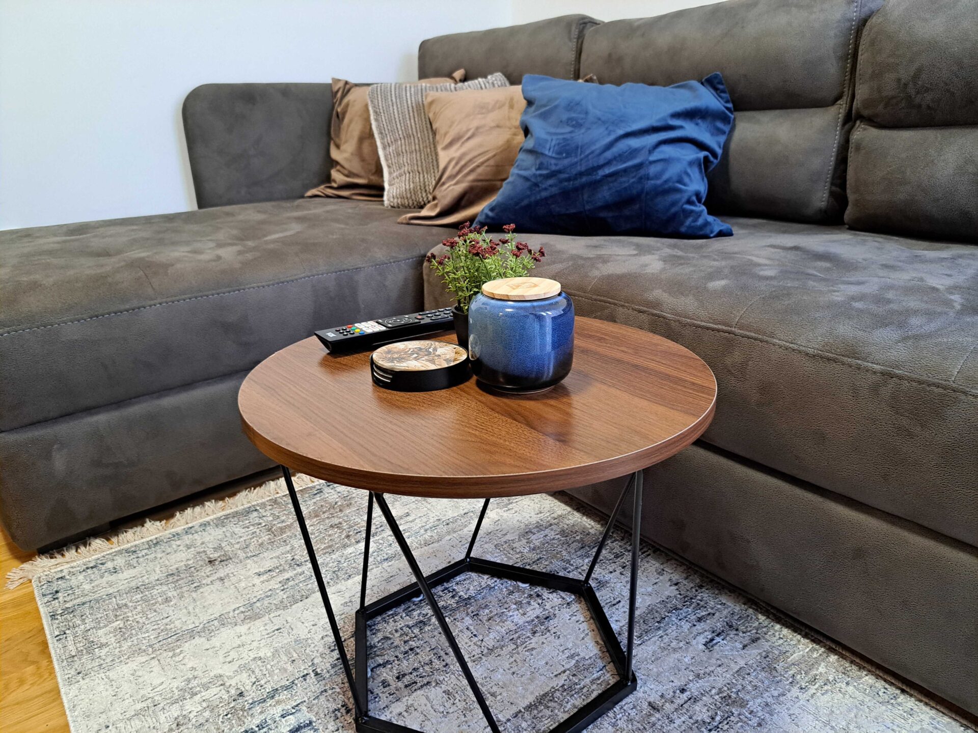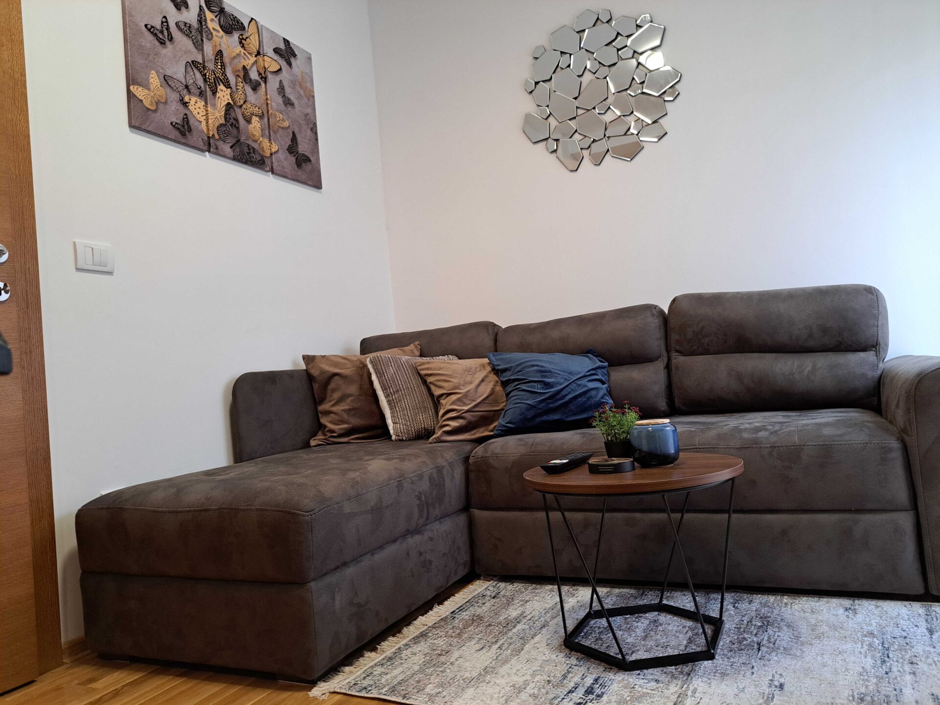 U dnevnom boravku je televizor, klub sto i ugaona garnitura koja se lako rasklapa i postaje francuski ležaj