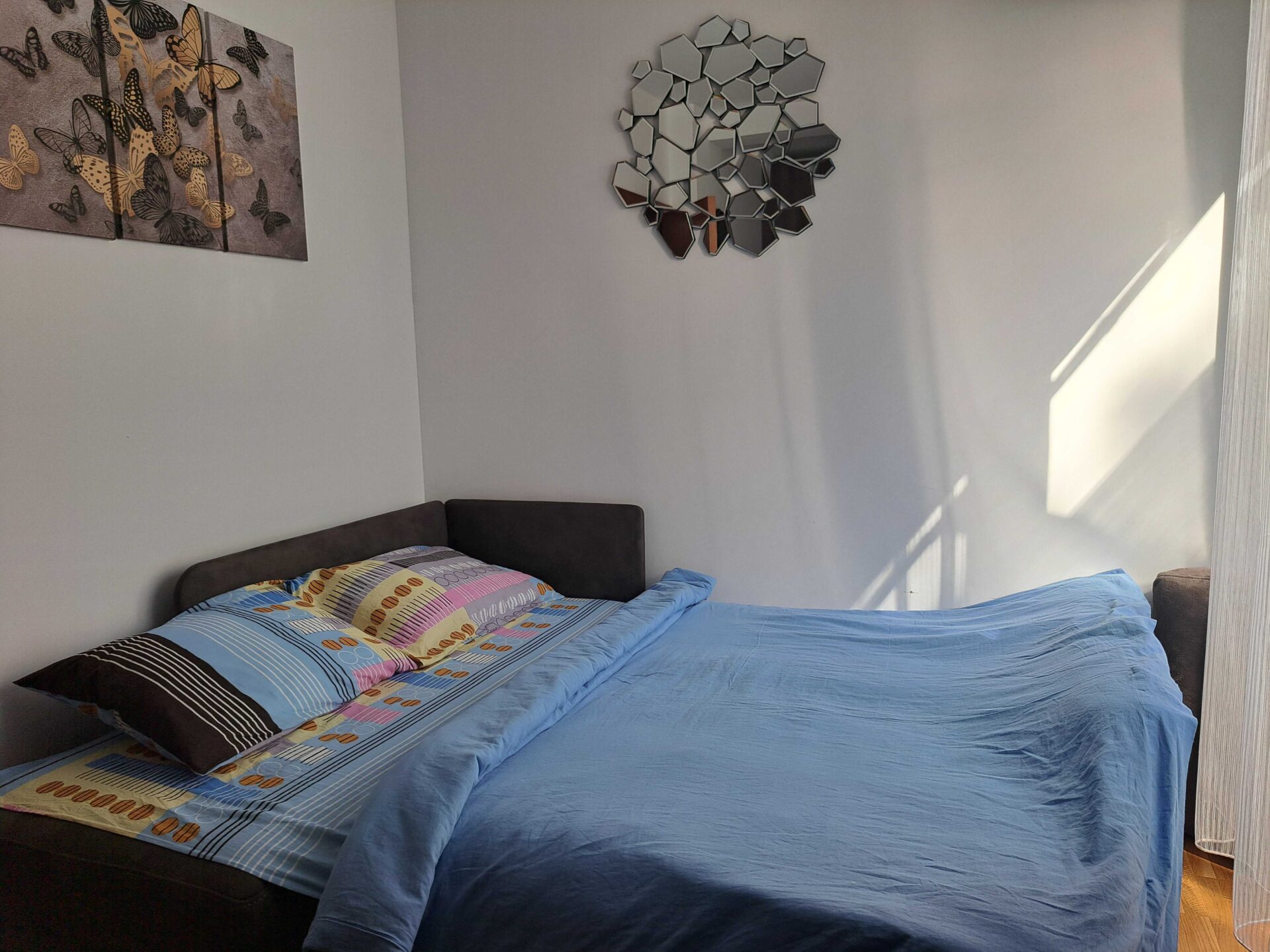 Spavaća soba sadrži francuski ležaj sa noćnim stočićima, lazy bag i ormar.