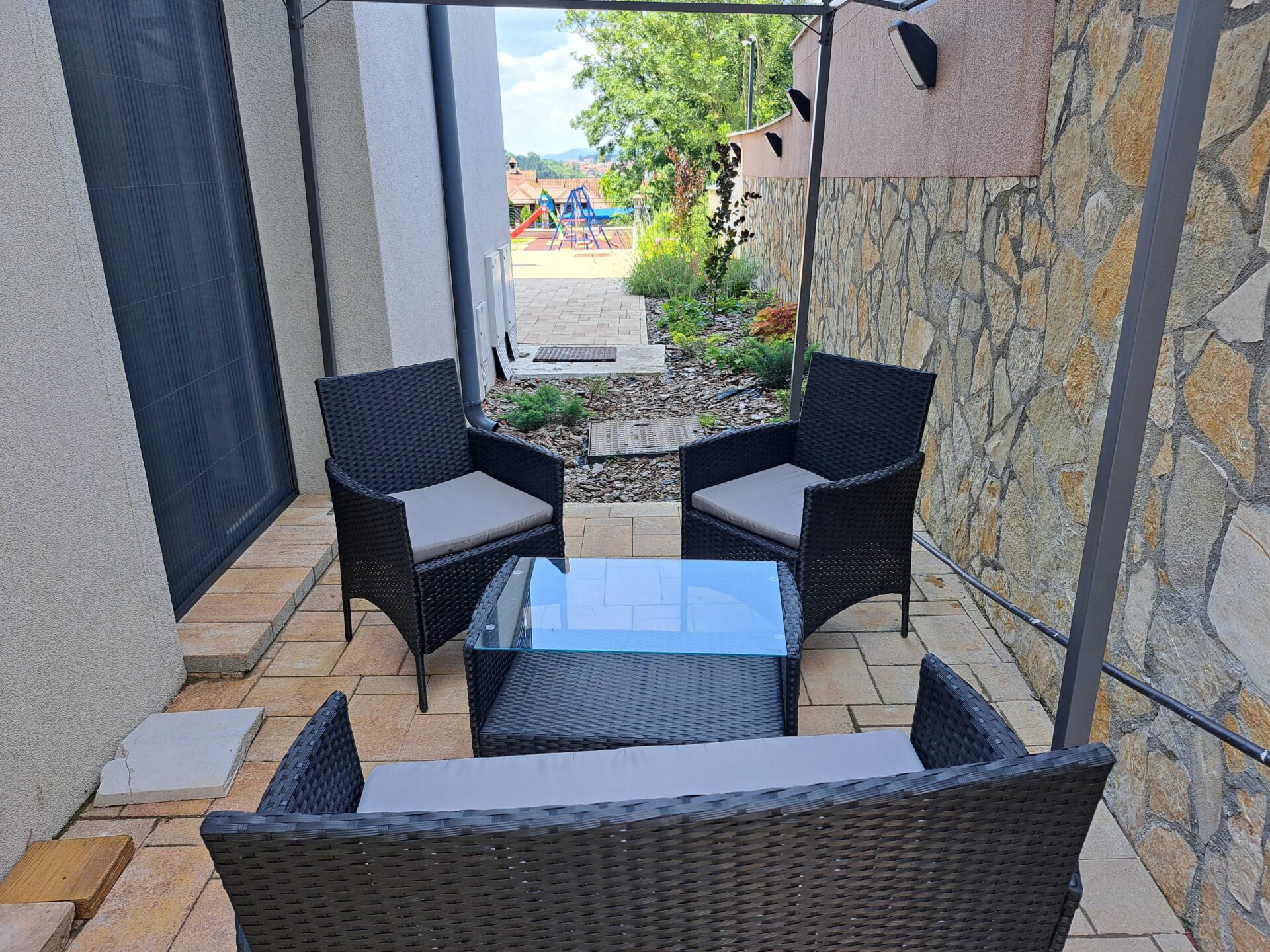 Najveća prednost ovog apartmana je uredjena terasa iz koje direktno izlazite u dvorište sa mobilijarom. Sa ove terase možete nadgledati vaše klince dok uživate u kafi. Posebno je prijatno u letnjim mesecima.